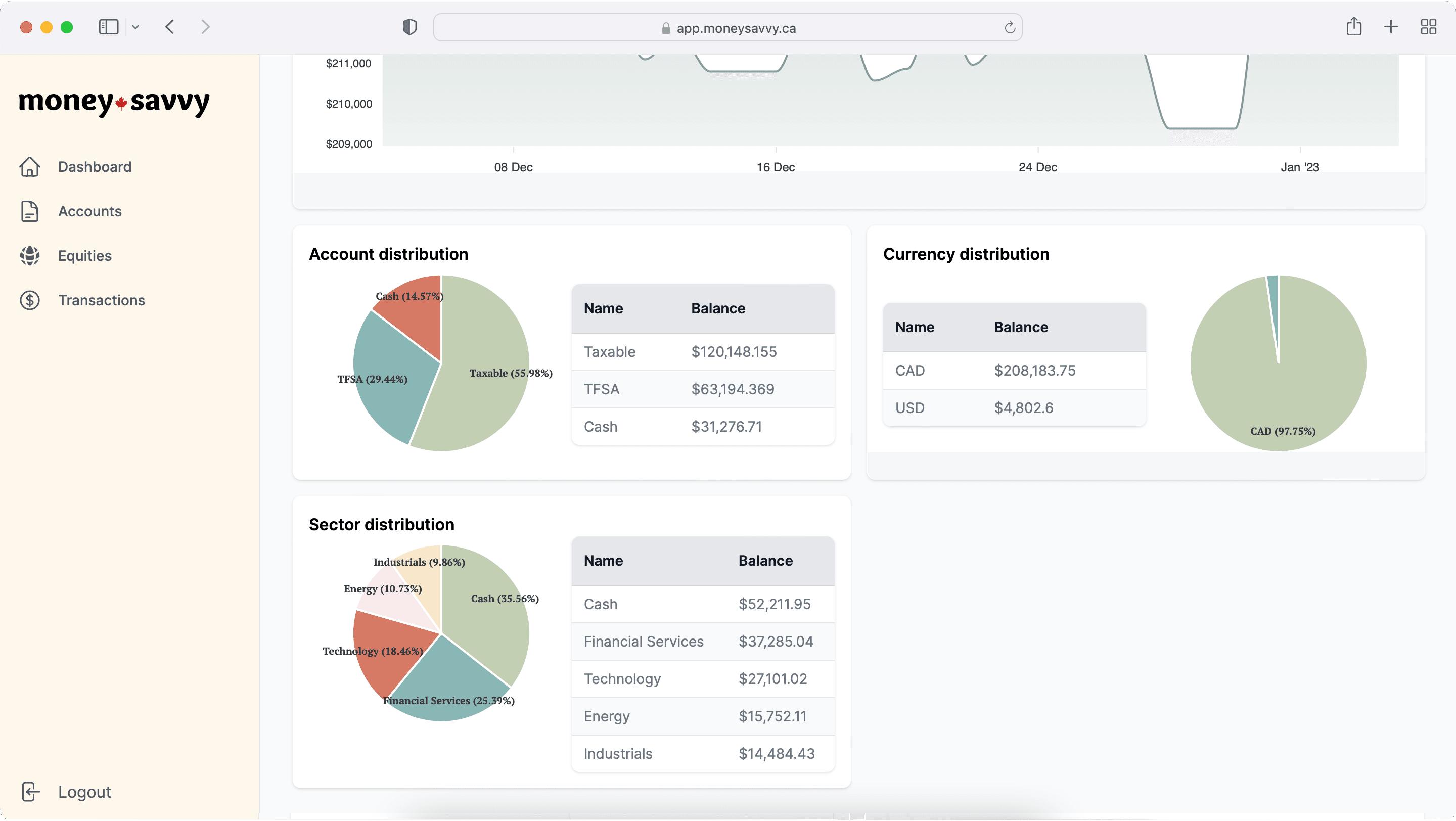 Easily view how your assets are distributed across different currencies, account types and sectors.